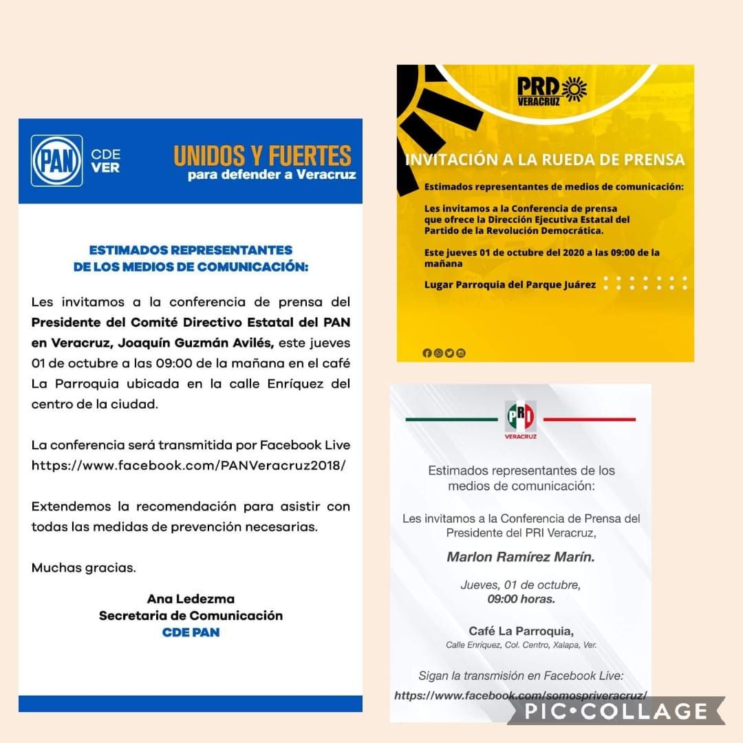 Este jueves por la mañana se espera una conferencia de prensa en la que de manera separada convocaron las dirigencias estatales de los partidos antes mencionados, para una misma hora y en el mismo lugar de la ciudad de Xalapa, en conocido café