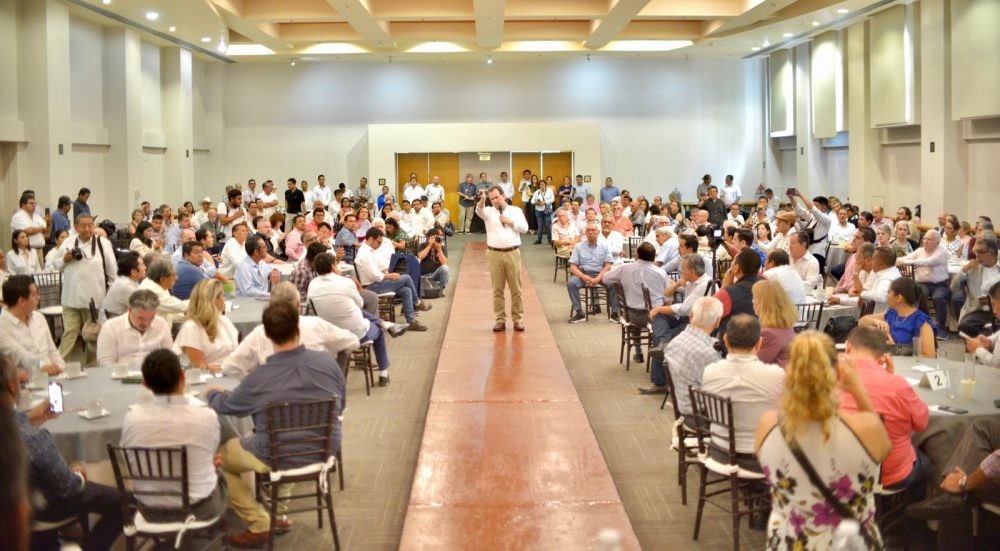 • Expone su propuesta ante hombres y mujeres de negocios de la capital del estado para recuperar el estado.