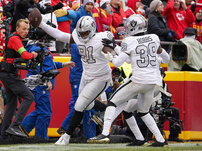 El gran tacle defensivo Bilal Nichols devolvió un balón suelto 8 yardas para touchdown, y Jack Jones recibió una intercepción 33 yardas para otra anotación 7 segundos después, ayudando a los Raiders (7-8) a romper una racha de seis derrotas consecutivas ante los Chiefs.