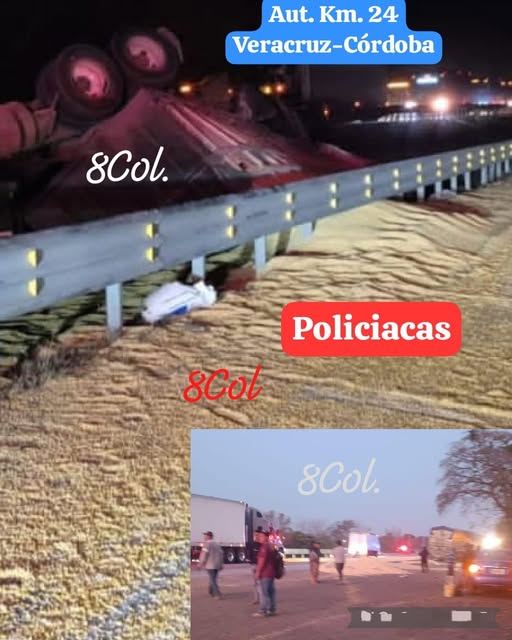 Autopista Córdoba – Veracruz, km 24. Reducción de carriles en ambos sentidos por atención de accidente (choque por alcance y volcadura de tracto camión). Maneja con precaución