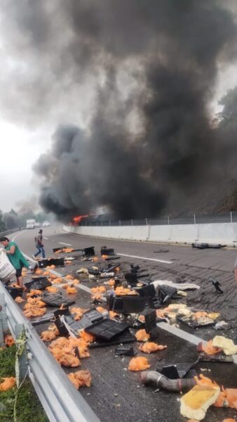 Esta volcadura con incendio del tractocamión se ubicó sobre la autopista 140 D #Perote – #Xalapa, a la altura de la curva El Fresno, en donde los actos de rapiña de pollos refrigerado no faltaron en la zona,
