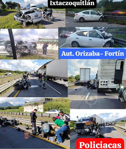 IXTACZOQUITLÁN, VER (8Col.)22/11/24.-. Un choque múltiple se registró la mañana de este viernes sobre la autopista Orizaba – Córdoba, a la altura del kilómetro 281 más 700, en la comunidad de Buena Vista, perteneciente a este municipio, donde dos tráileres, un coche y cinco motocicletas colisionaron, dejando como saldo 4 personas lesionadas.