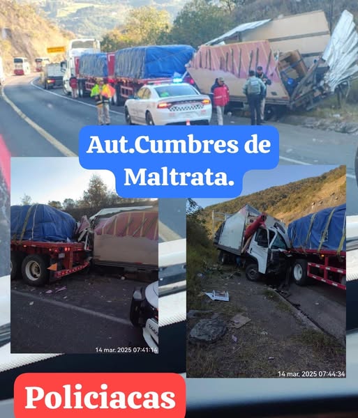 MALTRATA, VER.(8Col.)14/03/2025.- Un fuerte choque se registró la mañana de este viernes en la carretera autopista Puebla -Mendoza-Córdoba, en donde se involucra un vehículo tipo camión de carga y un tráiler con remolque (doble plana).