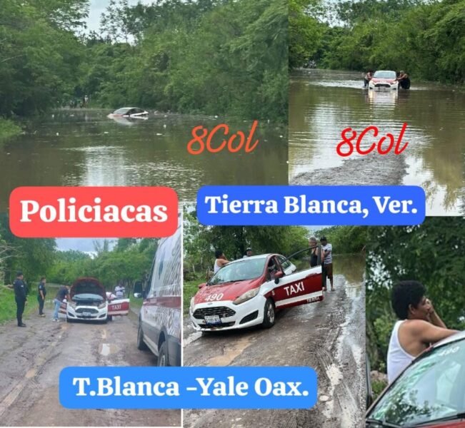 TIERRA BLANCA, VER.- (8Col.) 19/06/2025.- Tremendo susto se llevó el conductor de un automóvil de servicio de taxi de la localidad Tierra Blanca Veracruz, quien intentó pasar «cuerpo de agua» formado por los escurrimientos de las fuertes lluvias en esta  zona.