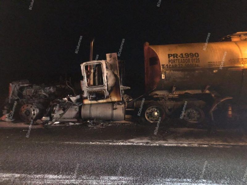 La unidad un tractor Kenworth una pipa doble remolque con placas de circulación 47AJ7R del servicio público Federal Transporte Especializados GaJa Y transportaba gasolina Magna
