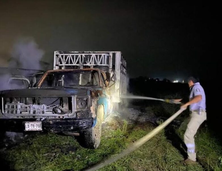 Vecinos alertaron por el humo y fuego visibles que se observaban en una milpa por lo que se trasladó personal de protección civil y bomberos quienes localizaron dos camionetas en llamas.