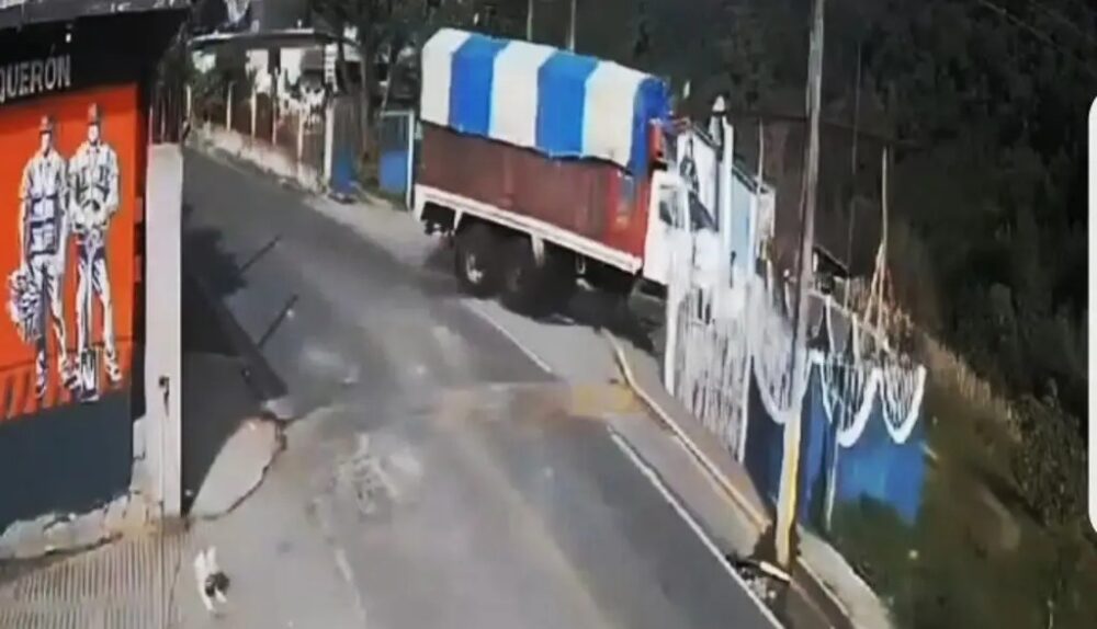A través de un pequeño video captado por una cámara de vigilancia de un domicilio particular se observa como el conductor de un torton se queda sin frenos y termina llevándose la barda de la capilla para después terminar su loca carrera en el terreno de la misma.
