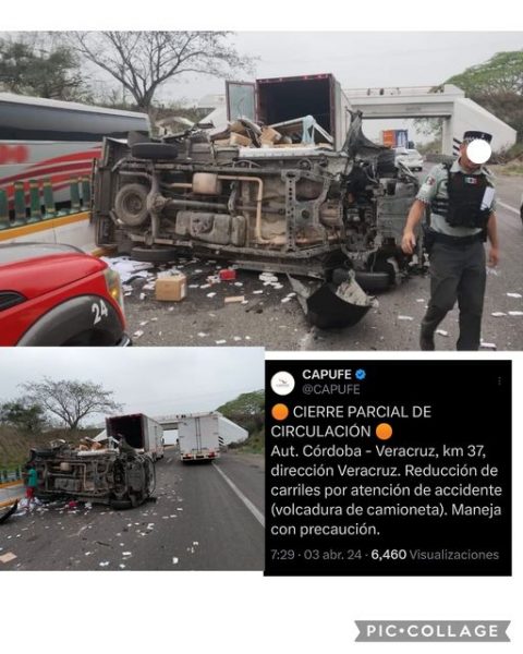 Aut. Córdoba – Veracruz, km 37, dirección Veracruz. Reducción de carriles por atención de accidente (volcadura de camioneta). Maneja con precaución.