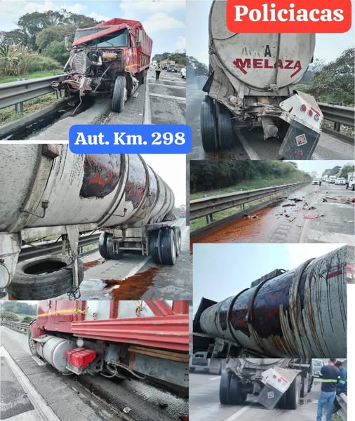 Lo anterior fue la versión que dio uno de los conductores que conducían los vehículos accidentados, que sufrieron daños de consideración en el accidente en el que la pipa estaba derramando la melaza sobre el pavimento y del torton el combustible y destrozado de la cabina.