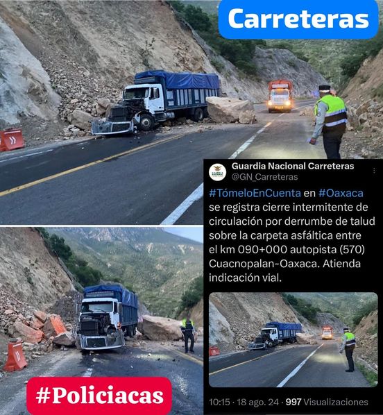 TómeloEnCuenta en #Oaxaca se registra cierre intermitente de circulación por derrumbe de talud sobre la carpeta asfáltica entre el km 090+000 autopista (570) Cuacnopalan-Oaxaca. Atienda indicación vial.