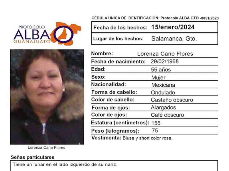 Integrantes del Colectivo Salamanca Unidos Buscando Desaparecidos denunciaron la desaparición de la mujer de 55 años de edad, de quien ya fue lanzada una Alerta del Protocolo ALBA.