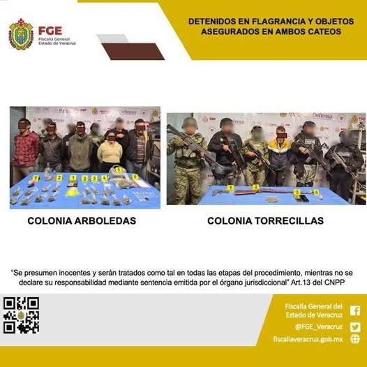 Puede ser una imagen de 12 personas y texto que dice "FGE Eetl Ceneral မနို်သသော်မာ်ရးပ Estado Veraerua Varachul DETENIDOS EN FLAGRANCIA Y OBJETOS ASEGURADOS EN AMBOS CATEOS Defeniso SSP earsa Defensa COLONIAARBOLEDAS COLONIA ARBOLEDAS COLONIA TORRECILLAS "Se presumen inocentes serán tratados como en todas las etapas del procedimiento, mientras no se declare su responsabilidad mediante sentencia emitida por el órgano jurisdiccional" Art.13 del CNPP f Fiscalla General del Estado Veracruz @FGE_Veracruz @FGE Veracruz fiscalliaveracruz.gob.mx"