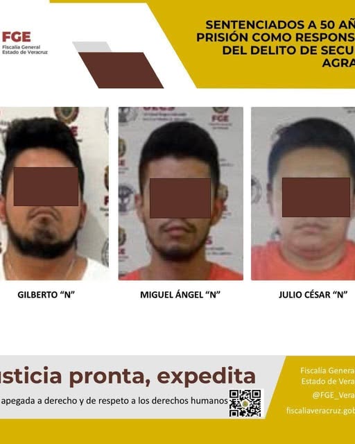 Coatzacoalcos, Ver., 5 de agosto del 2025.- La Fiscalía General del Estado informa que, a través de la Unidad Especializada en Combate al Secuestro y la Extorsión logró sentencia condenatoria de 50 años de prisión en contra de Gilberto “N”, Julio César “N” y Miguel Ángel “N” como responsables del delito de secuestro agravado en agravio de las víctima identificada con las iniciales G.H.P.