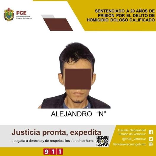 Córdoba, Ver.- La Fiscalía Regional Córdoba logró sentencia condenatoria de 20 años de prisión en contra de Alejandro “N” como responsable del delito de homicidio doloso calificado cometido en agravio de la víctima R.P.M.
