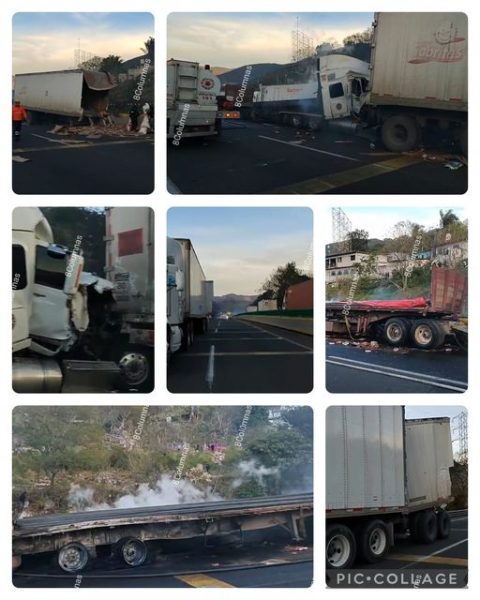 Km. 261 autopista Cd. Mendoza-Orizaba, altura la choza, carriles en ambas direcciones, choque de tractocamión doblemente articulado contra otro tractocamión y a su vez contra muro central, no hay paso con dirección a Veracruz y circulación solo por carril de baja carriles dirección Puebla, extremen precauciones.