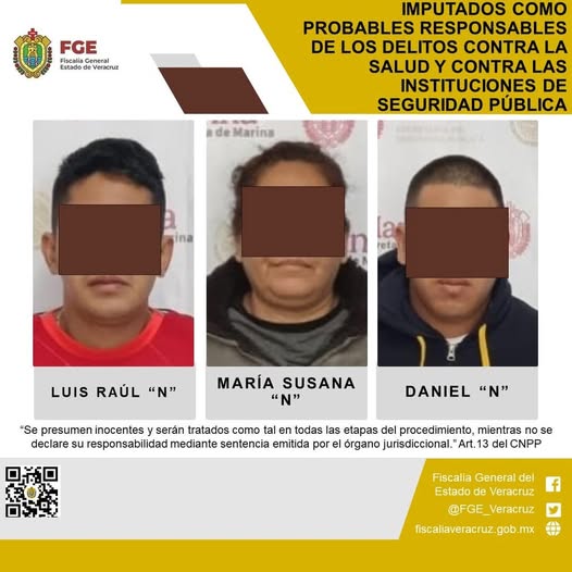 Puede ser una imagen de 3 personas y texto que dice "FGE Estado Estadod Estadod iscaliaGeneral liaCeneral eneral Veracruz veracruz IMPUTADOS COMO PROBABLES RESPONSABLES DE LOS DELITOS CONTRA LA SALUD Y CONTRA LAS INSTITUCIONES DE SEGURIDAD PÚBLICA ade deMarina ina las Nret reto LUIS RAÚL "N" MARÍA SUSANA "N" DANIEL "N" "Se presumen inocentes serán tratados como tal aler en todas las etapas del procedimiento, mientras no se declare su esponsabilidad mediante sentencia emitida por el . jurisdiccional. Art.13 del CNPP f Fiscalia General del Estado Veracruz @FGE_ @FGE_Veracruz Veracruz fiscaliaveracruz.gob.mx"
