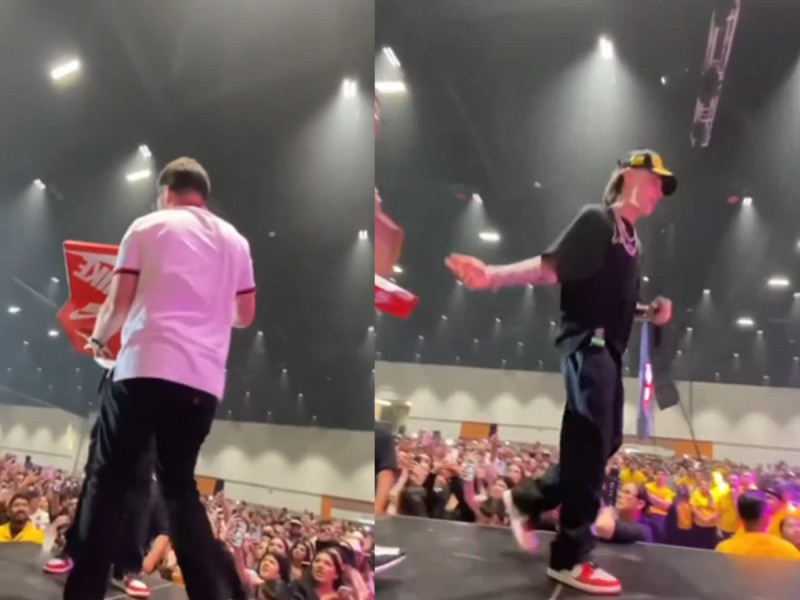 En redes sociales circula un video donde se ve a un joven subirse al escenario con una caja de tenis para ofrecérselos al músico.