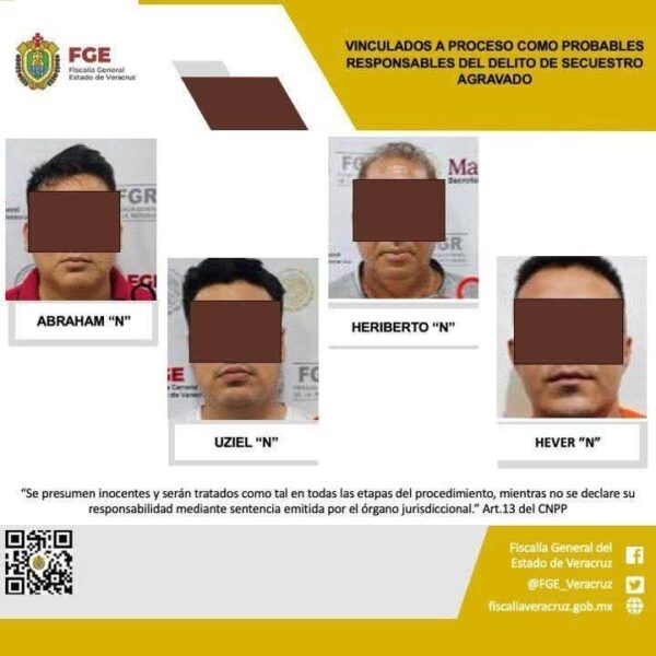 Coatzacoalcos, Ver., 25 de julio 2025.- La Unidad Especializada en Combate al Secuestro y la Extorsión obtuvo vinculación a proceso en contra de Hever “N”, Abraham “N”, Uziel “N” y Heriberto “N”, identificados como objetivos prioritarios, como probables responsables del delito de secuestro agravado, cometido en agravio de la víctima identificada con las iniciales L.V.R.