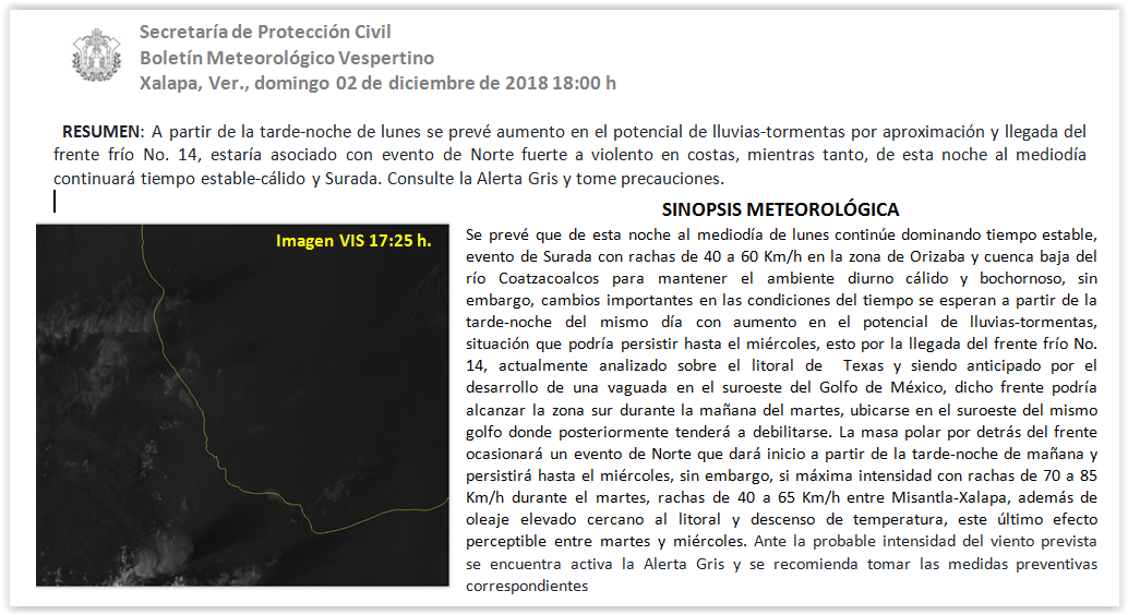 De acuerdo a la Secretaria de Protección Civil ya se prevee de la entrada del frente frió numero 14 el cual se espera podría estar podría entrando a territorio veracruzano durante la tarde noche de este lunes 3 de diciembre, pero que de acuerdo a los pronósticos, lo mas intenso de este evento podría darse para los siguientes dos días que serían el marte 4 y miércoles 5 del mes en curso.