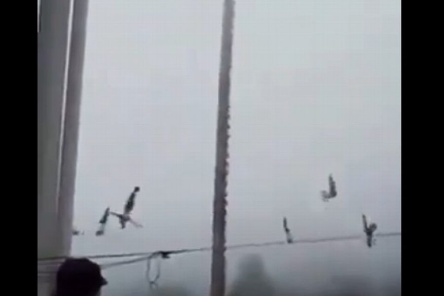 En las imágenes se puede observar que los danzantes estaban realizando su espectáculo cuando de pronto una de las cuerdas que los sostiene se soltó y la víctima sufre la terrible caída.