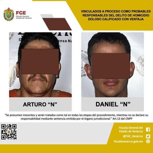 Xalapa, Ver., 18 de julio 2025.-La Fiscalía General del Estado, a través de la Fiscalía Regional Xalapa, obtuvo vinculación a proceso en contra de Arturo “N” y Daniel “N” como probables responsables del delito de homicidio doloso calificado con ventaja, cometido en agravio de la víctima identificada con las iniciales M.B.O.