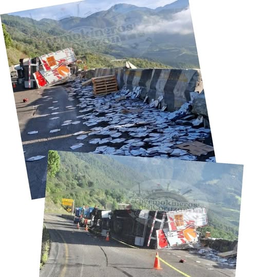 MALTRATA, VER.(29/07/2025.- Una aparatosa volcadura de unidad de carga se registró la madrugada de este martes cuando el vehículo en mención circulaba de norte a sur, saliendo de uno de los túneles del km. 231 bajando las Cumbres de Maltrata.